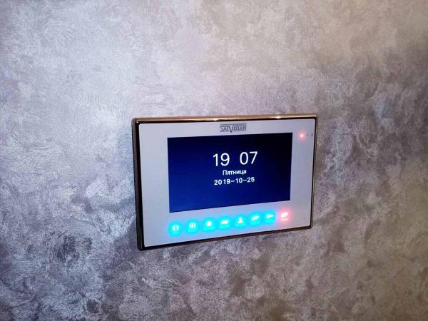 Приняли решение установить домофон на 7 дюймов и вызывную панель, модель имеет встроенный датчик движения и позволяет снимать небольшие видеоролики на карту памяти, при появлении движения в кадре перед вызывной панелью.